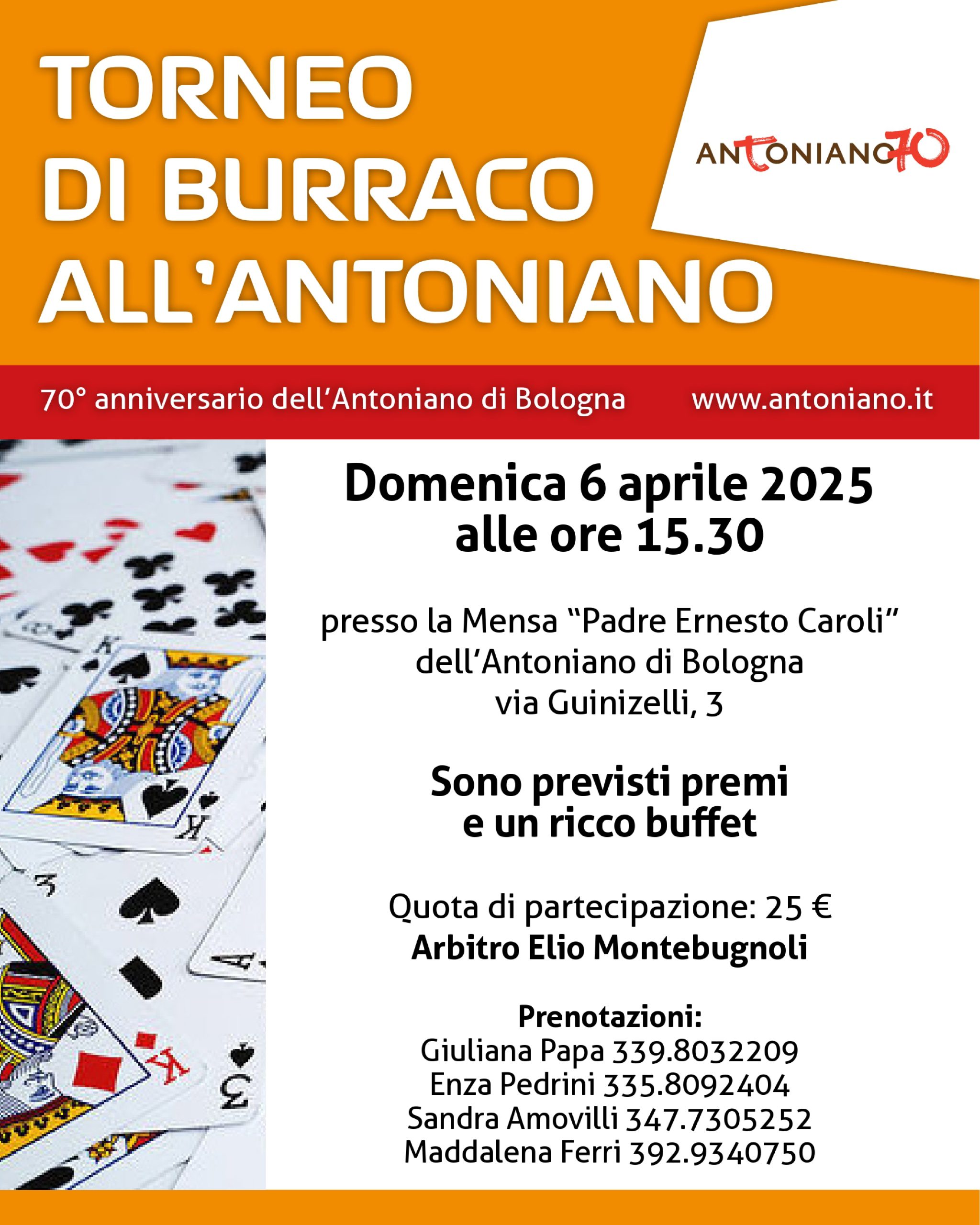 In occasione del 70° anniversario dell’Antoniano di Bologna, il Comitato Femminile organizza un torneo di burraco a sostegno della Mensa Padre Ernesto Caroli, che ogni anno garantisce oltre 1.000 pasti alle persone in difficoltà.