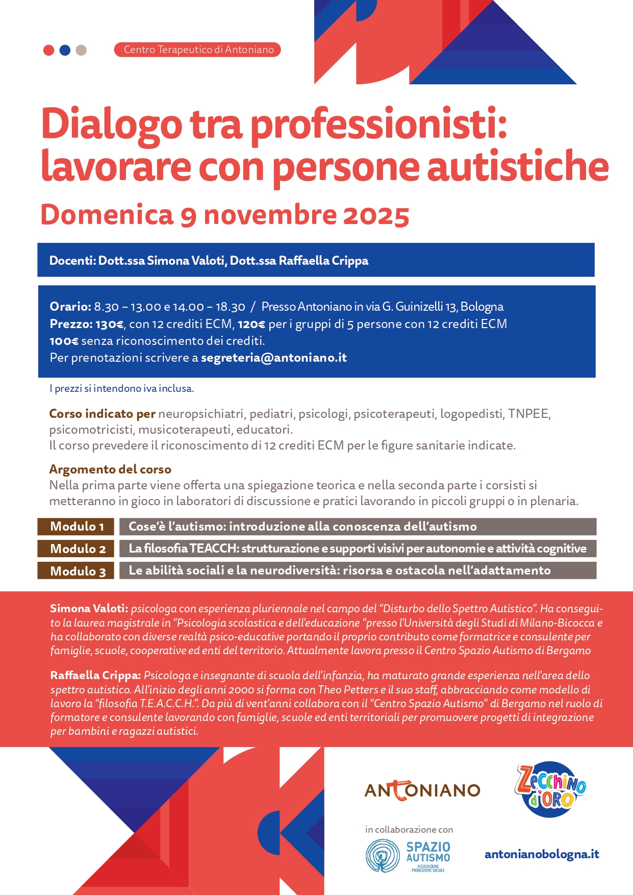 Il corso formativo ha l’obiettivo di offrire ai professionisti strumenti teorici e pratici per comprendere meglio il disturbo dello spettro autistico e favorire relazioni educative ed esperienze inclusive più efficaci. Attraverso momenti di approfondimento e laboratori esperienziali, i partecipanti impareranno a comprendere i bisogni delle persone autistiche, a utilizzare strategie di strutturazione e supporti visivi per promuovere autonomie e abilità cognitive, e a valorizzare la neurodiversità come risorsa nelle relazioni sociali e nei contesti educativi.