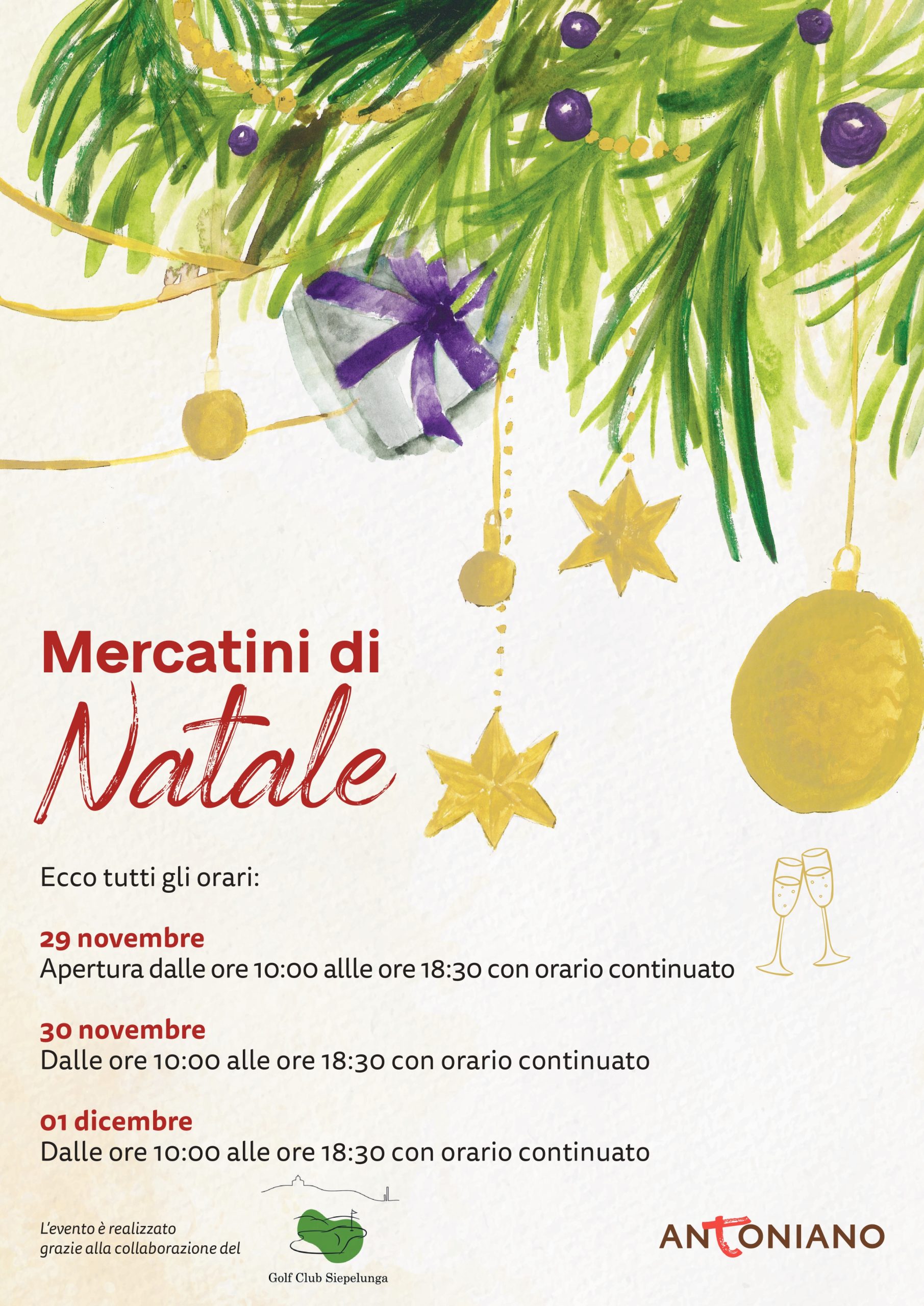 Quest’anno, immergiti nella magia del Natale con il Mercatino di Antoniano, dal 29 novembre al 1 dicembre, presso il Golf Club Siepelunga in via Siepelunga, 56/4 a Bologna. Dalle 10:00 alle 18:30, potrai trovare regali unici, decorazioni natalizie e prodotti selezionati, perfetti per celebrare le festività in modo speciale.